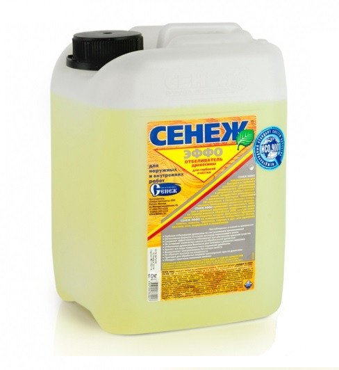 Отбеливатель Сенеж Эффо предназначен для быстрого глубокого осветления деревянных поверхностей, потемневших в результате грибных окрашиваний, воздействия атмосферных и временных факторов, солнечного УФ излучения, а также удаления поверхностного биопоражения различной природы.